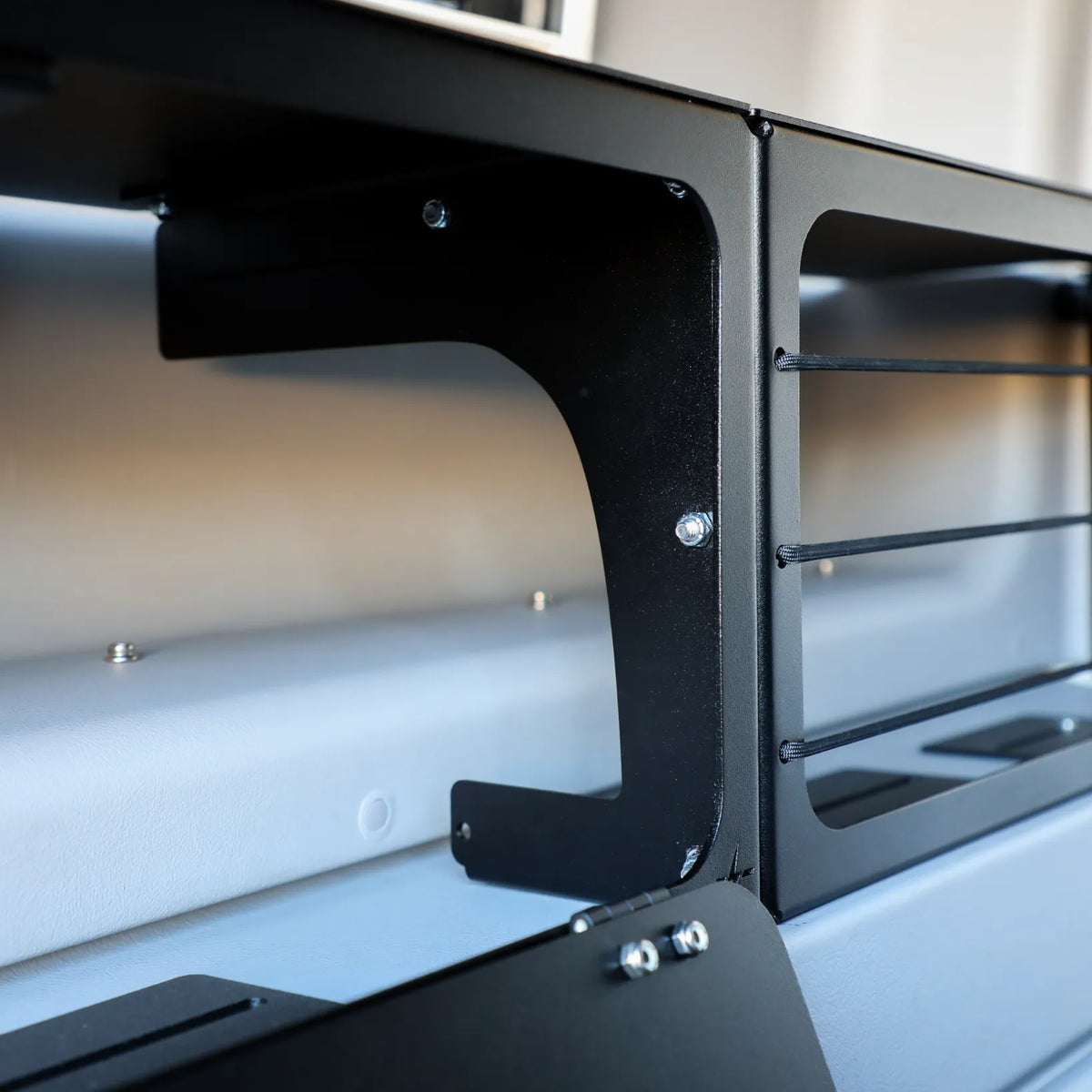 6 L-Track Style Mounting Holes Material: 1/8" High-Grade Aluminum Compatibility: Storyteller Overland Mode *NOT compatible with Mode LT (Transit) *NOT COMPATIBLE WITH +2024 STO MODEL YEAR Mounting: Screw in directly inside your rear doors.
